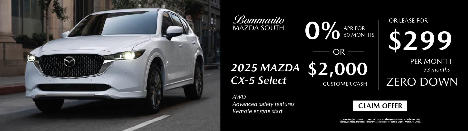 2025 Mazda CX-5 Select Lease $299 OR 0% APR Or $2,000 Customer Cash