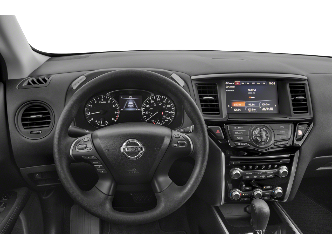 Inside, the Pathfinder offers seating for up to seven passengers, with ample room for everyone and their cargo. The cloth-upholstered seats are both comfortable and durable, and the 3rd-row bench seat provides added flexibility when you need extra space. Stay connected with the AM/FM/CD audio system and NissanConnect infotainment system, which includes features like SiriusXM radio and steering wheel-mounted audio controls.