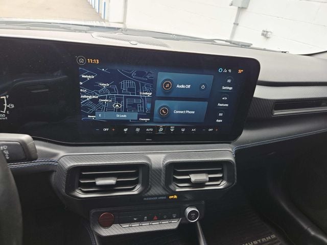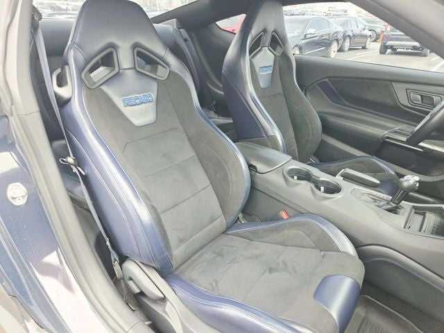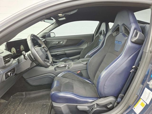 This Mustang is well Equipped with Dark Horse Appearance Package (Notorious Blue Unique Brake Calipers, Painted Black Roof, and Unique Hood Graphic), Equipment Group 700A Deluxe Package (Aluminum Foot Pedals, Approach Detection, Cloth/Vinyl Climate-Controlled Bucket Seats, Memory Driver Seat & Mirrors, and Universal Garage Door Opener (UGDO)), Ford Co-Pilot360 Assist+ (Adaptive Speed Control w/Stop & Go, Connected Built-In Navigation, and Lane-Keeping System w/Lane Keeping Aid), RECARO Sport Seats (RECARO Micro-Suede/Vinyl Bucket Seats), Security Package (Active Anti-Theft System, Electronic-Locking Center Console, and Wheel Locking Kit), 12 Speakers, 4-Wheel Disc Brakes, ABS brakes, Adaptive suspension, Air Conditioning, Alloy wheels, AM/FM radio: SiriusXM with 360L, AM/FM Stereo, Auto High-beam Headlights, Auto-dimming Rear-View mirror, Automatic temperature control, B&O Sound System by Bang & Olufsen, Brake assist, Bumpers: body-color, Cloth/Vinyl Heated Bucket Seats, Compass, Delay-off headlights, Driver door bin, Driver vanity mirror, Dual front impact airbags, Dual front side impact airbags, Electronic Stability Control, Emergency communication system: 911 Assist, Exterior Parking Camera Rear, Four wheel independent suspension, Front anti-roll bar, Front Bucket Seats, Front Center Armrest, Front dual zone A/C, Front reading lights, Fully automatic headlights, HD Radio, Heated front seats, Heated steering wheel, Illuminated entry, Knee airbag, Low tire pressure warning, Navigation system: Connected Navigation, Occupant sensing airbag, Outside temperature display, Overhead airbag, Overhead console, Panic alarm, Passenger door bin, Passenger vanity mirror, Power door mirrors, Power driver seat, Power passenger seat, Power steering, Power windows, Radio data system, Rain sensing wipers, Rear anti-roll bar, Rear Parking Sensors, Rear window defroster, Remote keyless entry, SiriusXM w/360L, Speed control, Speed-sensing steering, Speed-Sensitive Wipers, Split folding rear seat, Spoiler, Sport steering wheel, Steering wheel mounted audio controls, SYNC 4.0 QNX, Tachometer, Telescoping steering wheel, Tilt steering wheel, Traction control, Trip computer, Variably intermittent wipers, Voltmeter, and Wheels: 19 x 9.5 Fr & 19 x 10 Rr Aluminum.